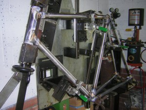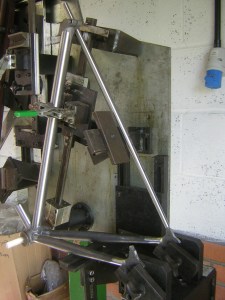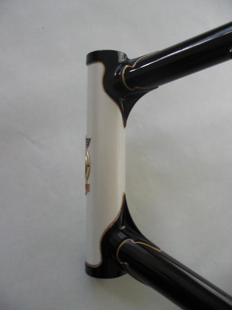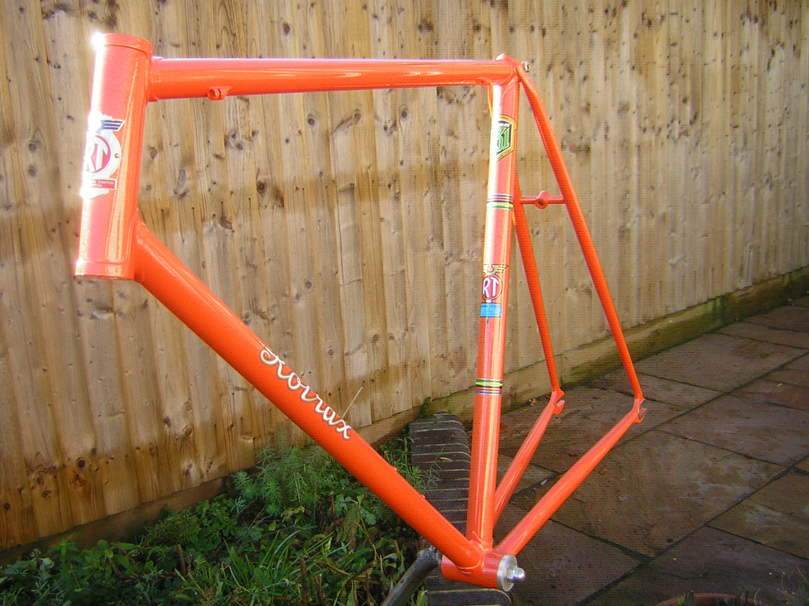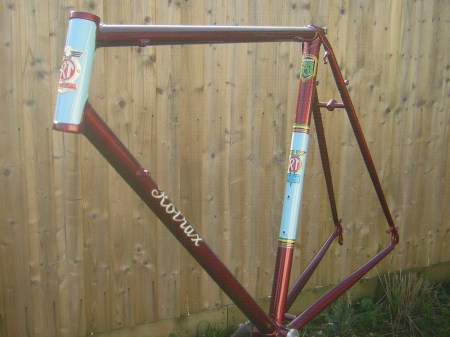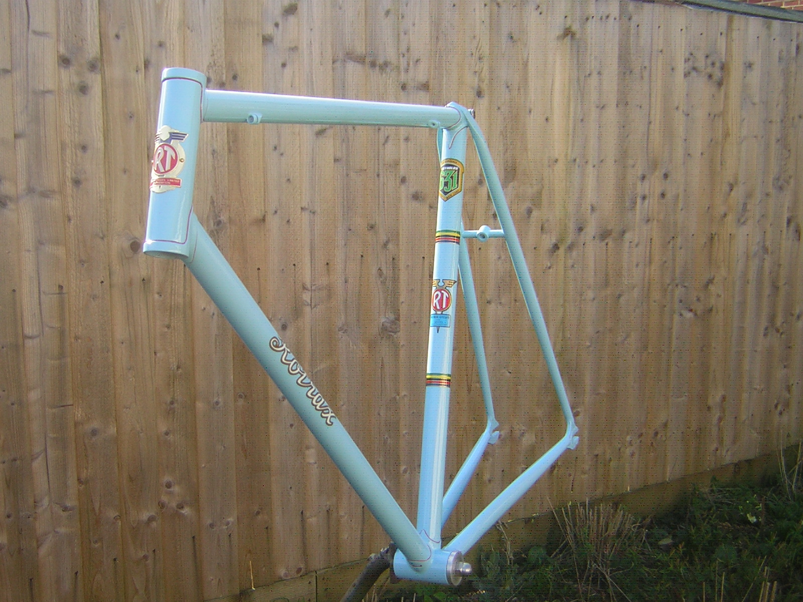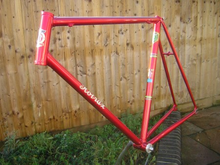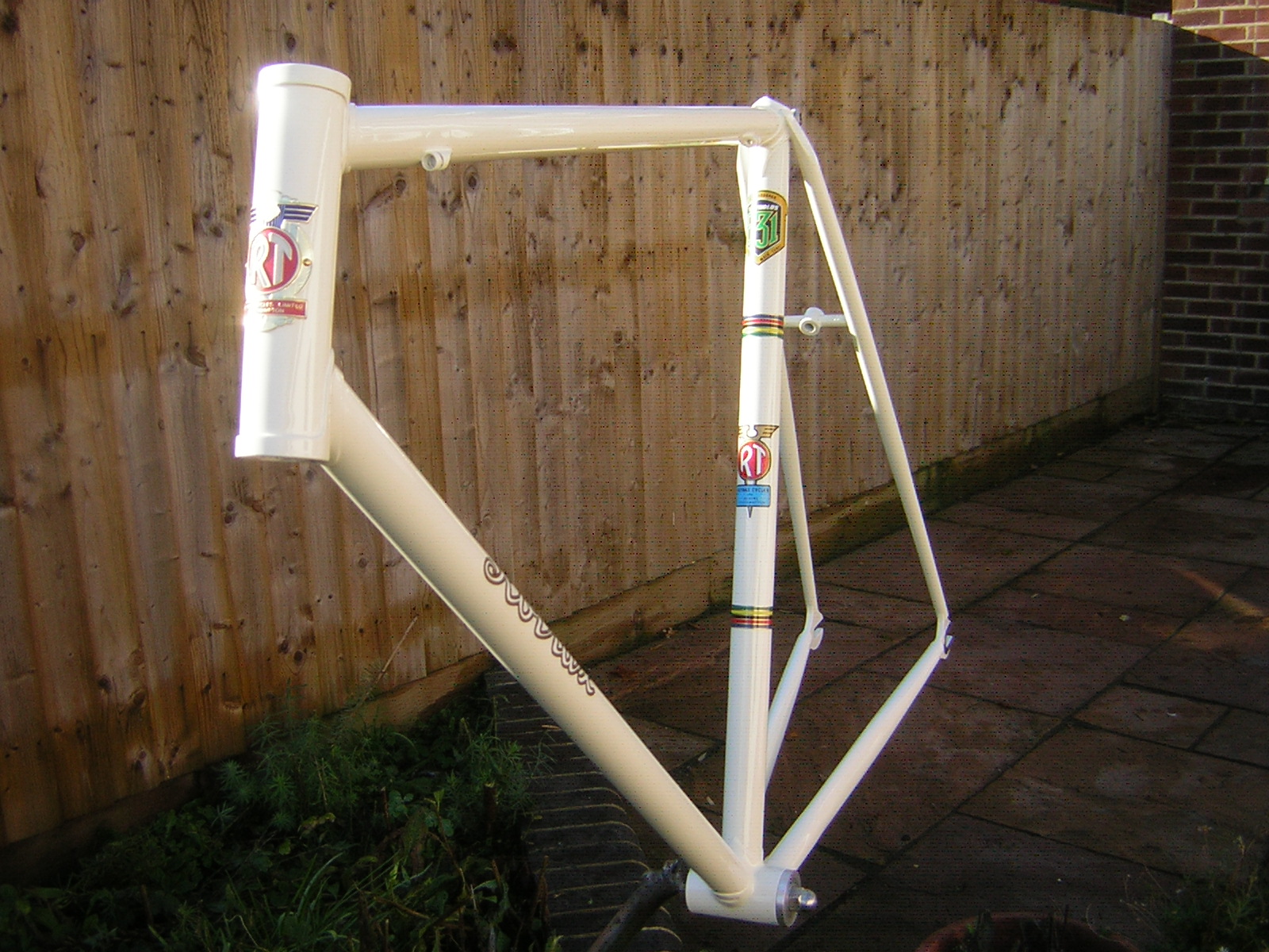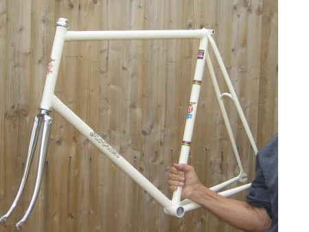 Frameset size 53cm centres, tubing lightweight heat treated steel double butted Reynolds 853 Tour, brazed construction, microcast steel lugs for extra stiffness.
